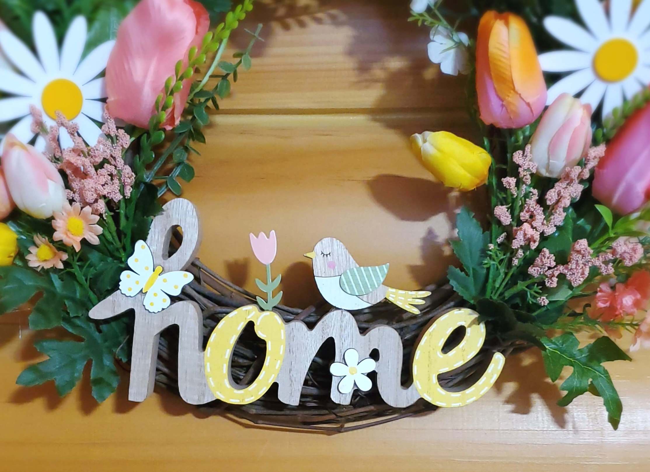 Grapevine wreath with pink, peach, yellow, white flowers and wooden "home" accent.