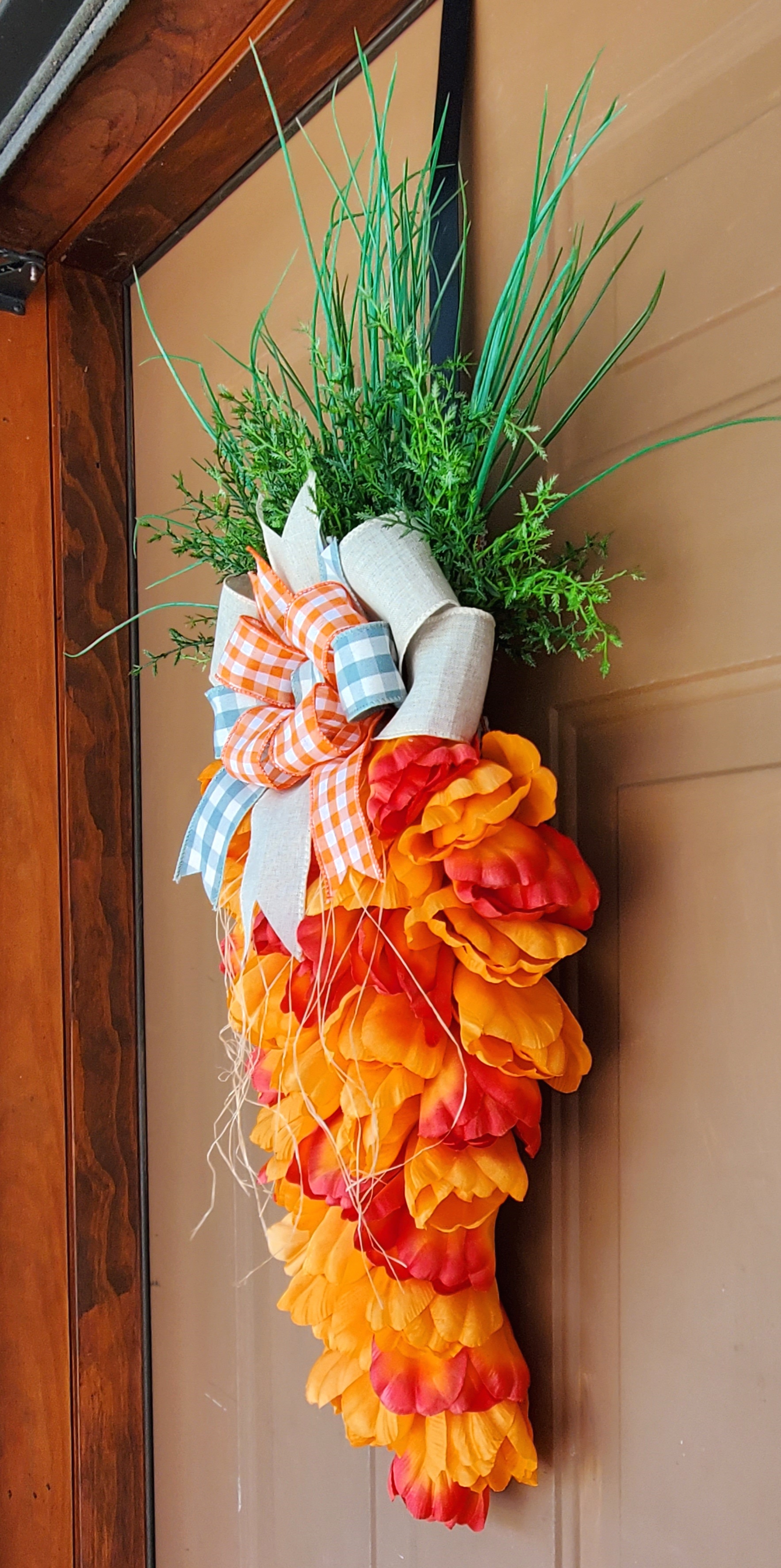 This tulip carrot has a little bit of raffia cascading down the front of it.